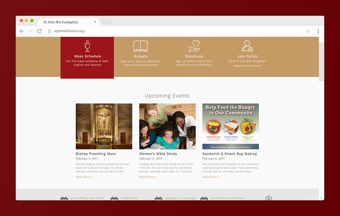 We were thrilled to work with the Cathedral of Christ the King. When thinking about how to approach the site, we wanted to take every advantage of the photographs they provided. We decided to give their website a modern welcoming by having a full-page image with their logo and mission statement. The client asked to have their homepage act as a single-site page, with subsequent pages taking a deeper dive into specific topics. The result is a website with many robust features.