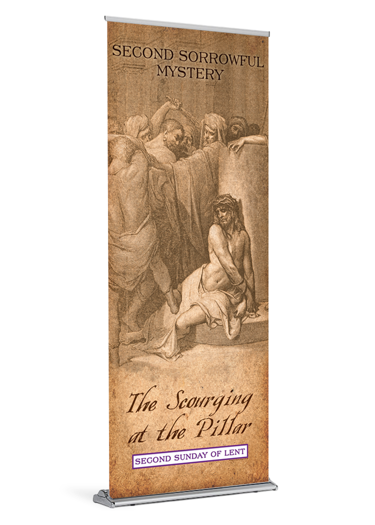 This Lent banner is approximately 84″ tall. It is printed on durable, high quality paper with water resistant inks.