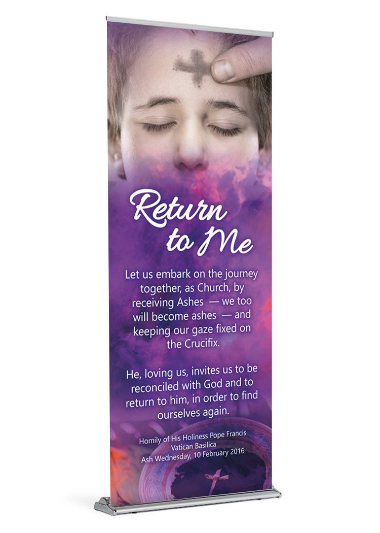 If you ordered a banner with your stand the banner will come installed and ready be displayed. All you need to do is insert the pole and pull the banner up. If your parish already owns a stand, your banner will arrive with a bottom rail that is quick and easy to slide into your stand.
