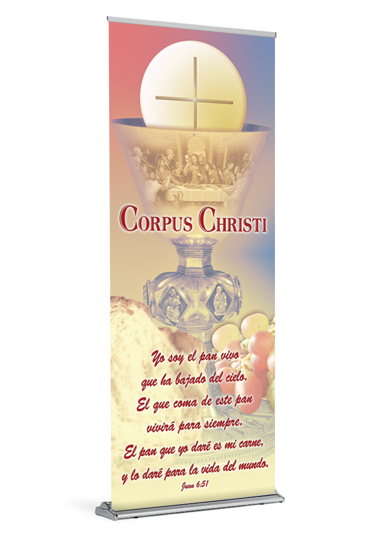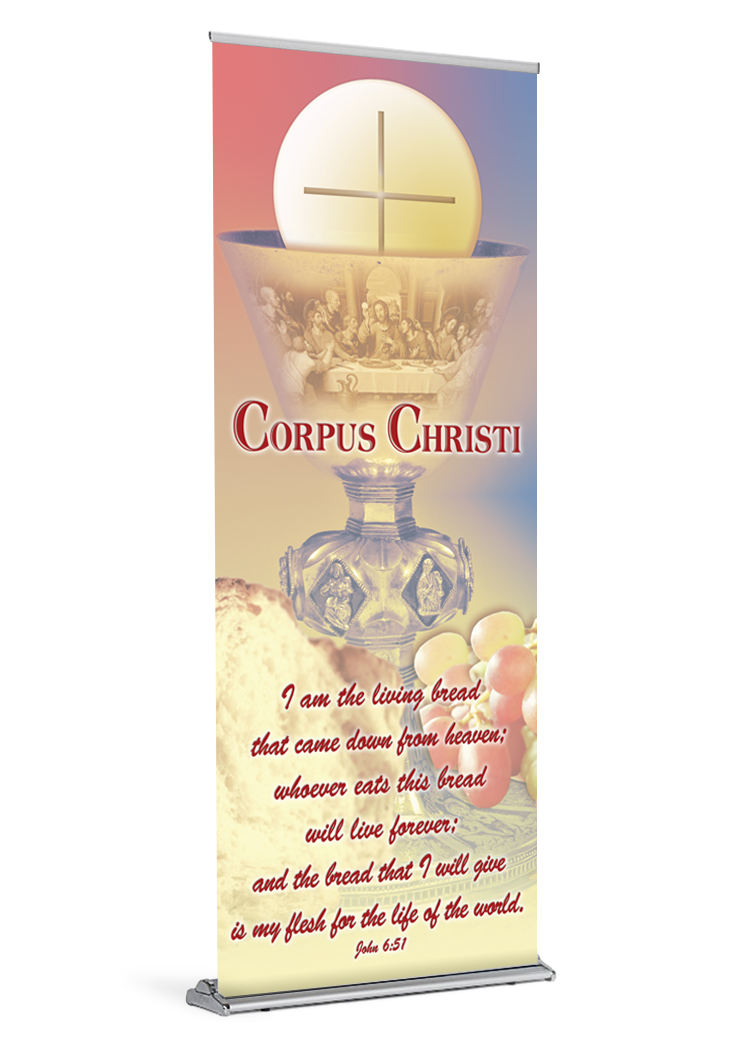 This elegant banner, with the stirring words of the Gospel of John, is a fitting addition to your church for the Feast of the Most Holy Body and Blood of Christ. It can also be used for First Communion and for Ordinary Time.