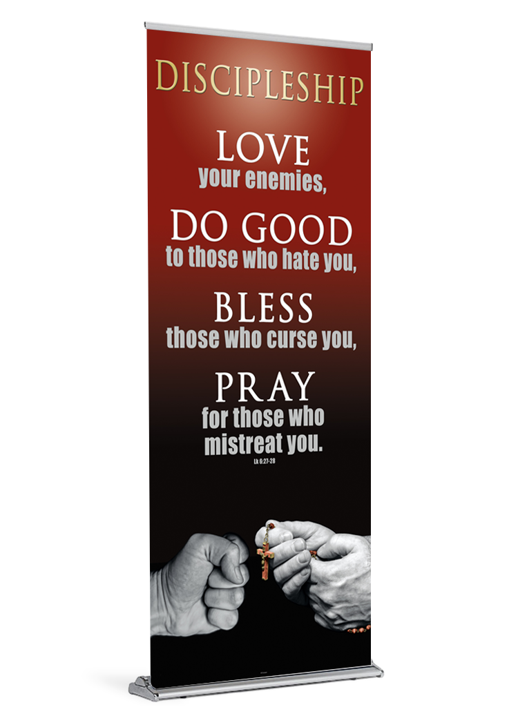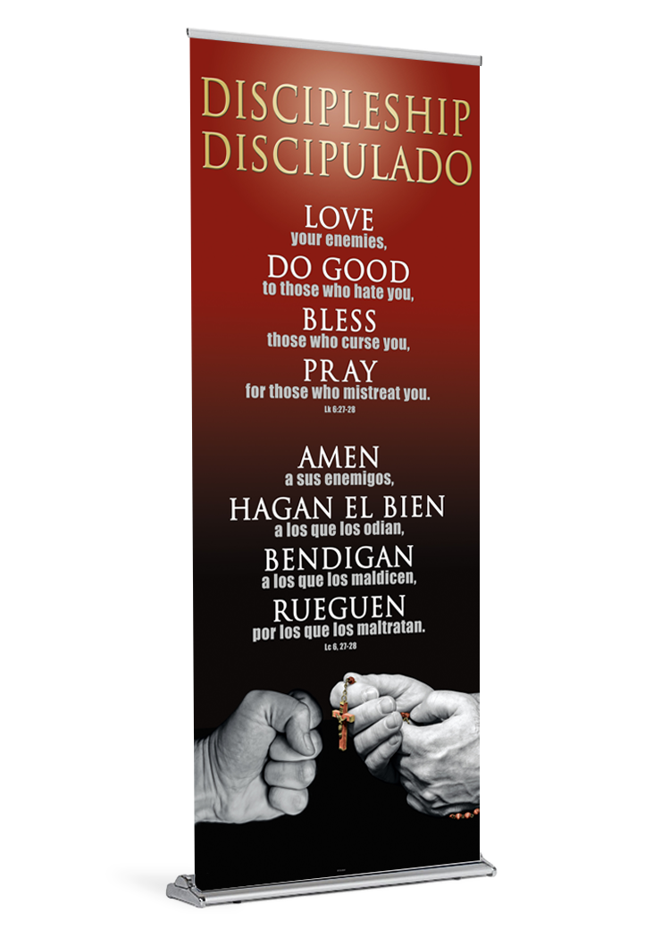 If you ordered a banner with your stand the banner will come installed and ready be displayed. All you need to do is insert the pole and pull the banner up. If your parish already owns a stand, your banner will arrive with a bottom rail that is quick and easy to slide into your stand.