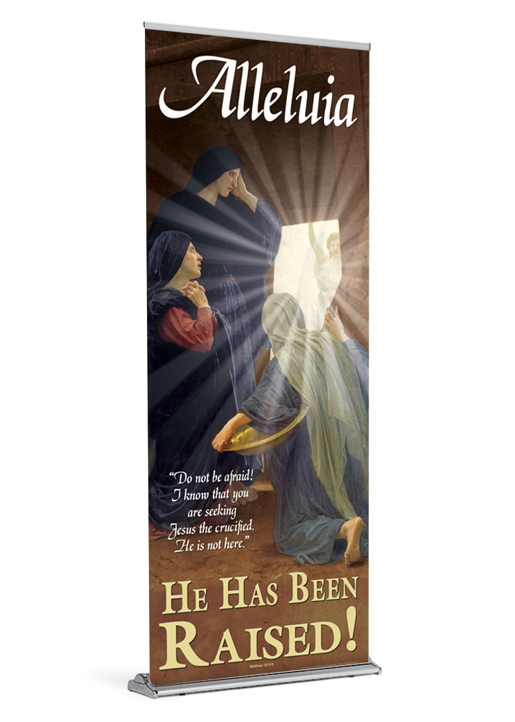 If you ordered a banner with your stand the banner will come installed and ready be displayed. All you need to do is insert the pole and pull the banner up. If your parish already owns a stand, your banner will arrive with a bottom rail that is quick and easy to slide into your stand.