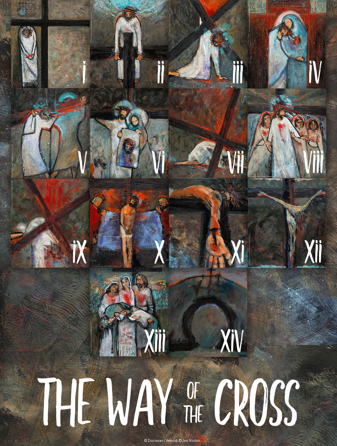 Stations of the Cross art is by Jen Norton. Individual paintings can be found here in our Library of Art.