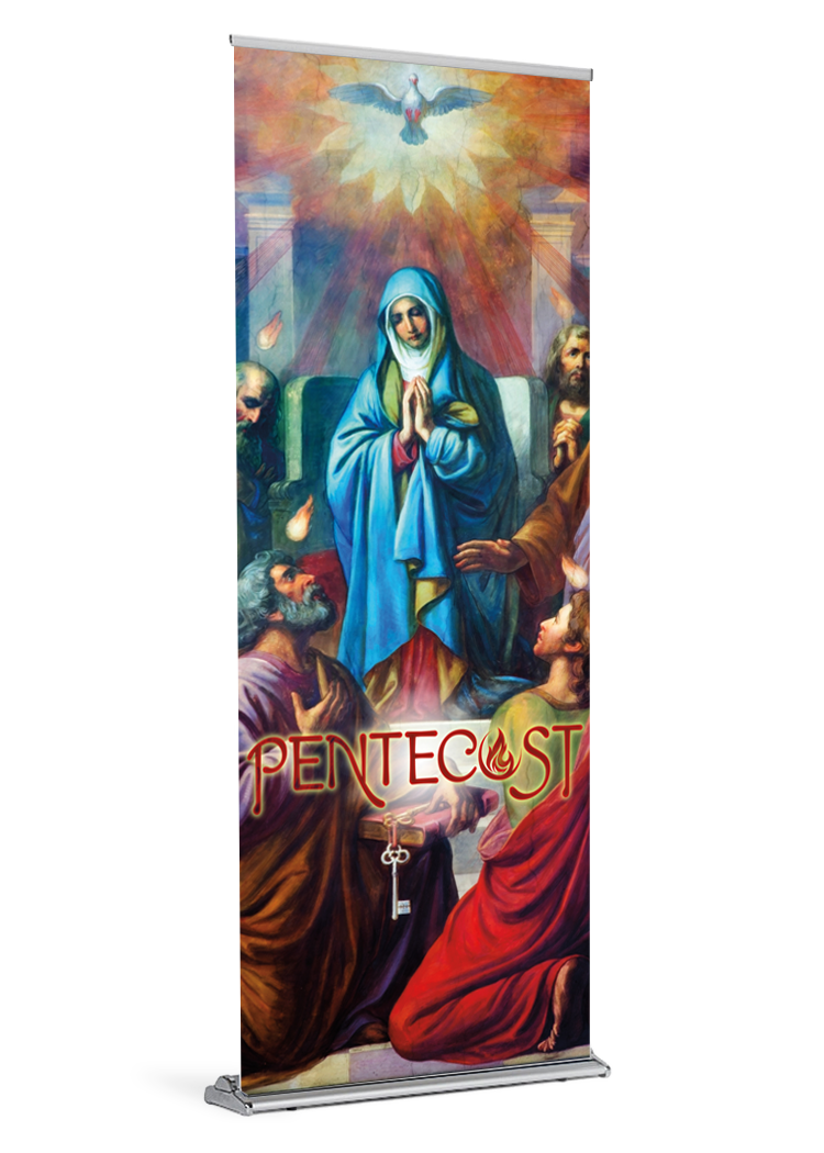 Pentecost is a major feast day in the Church. Celebrated on the Sunday that falls on the 50th day of Easter, it commemorates the descent of the Holy Spirit on the Apostles and other disciples following the Crucifixion, Resurrection, and Ascension of Jesus Christ (Acts 2), and it marks the beginning of the Church’s mission to the world. Pentecost is quite simply the birth of the Church. Celebrate this wondrous event by invoking the Holy Spirit with a beautiful banner for your parish.