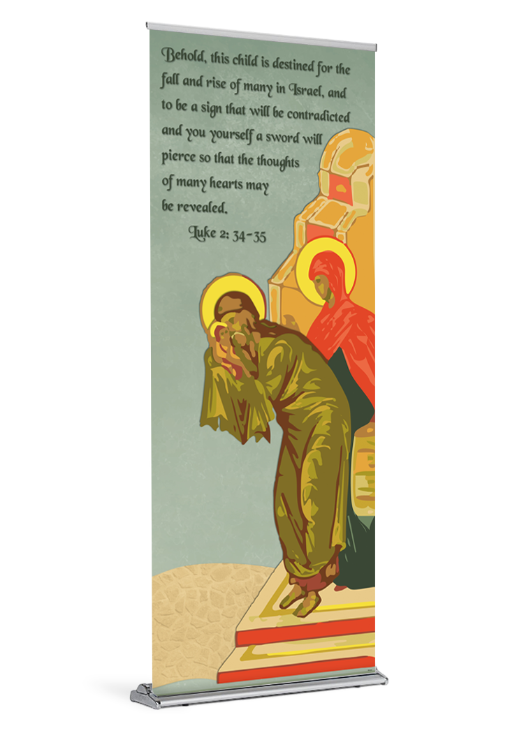 This Presentation of the Lord banner is approximately 84″ tall. It is printed on durable, high quality paper with water resistant inks.