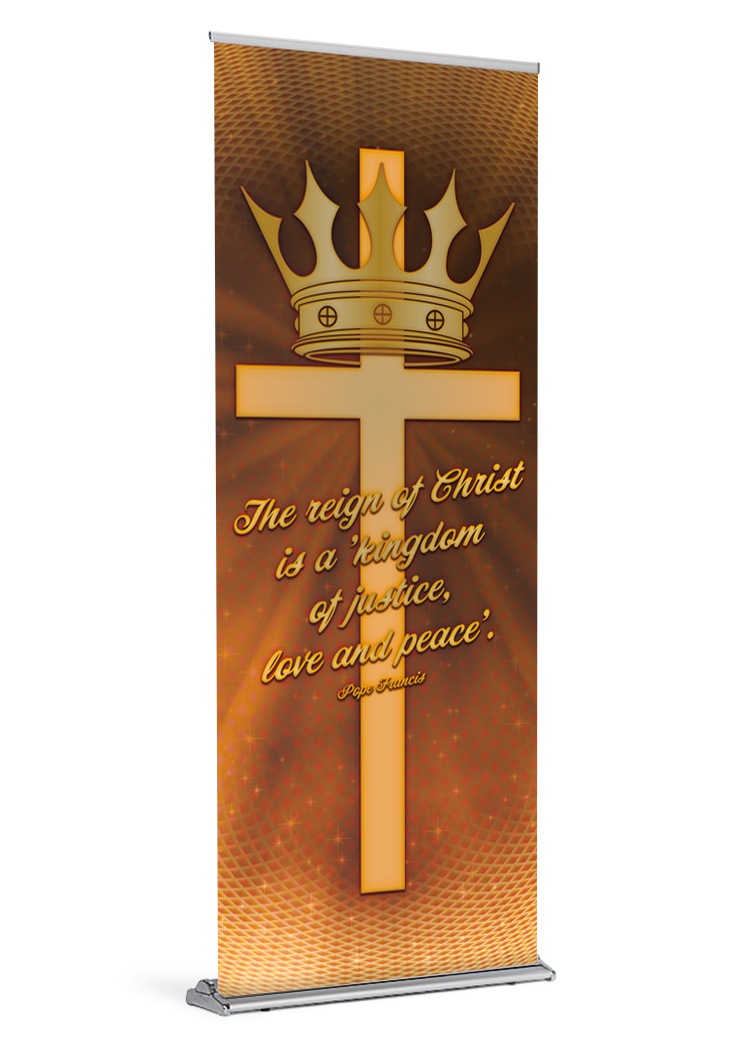 If you ordered a banner with your stand the banner will come installed and ready be displayed. All you need to do is insert the pole and pull the banner up. If your parish already owns a stand, your banner will arrive with a bottom rail that is quick and easy to slide into your stand.