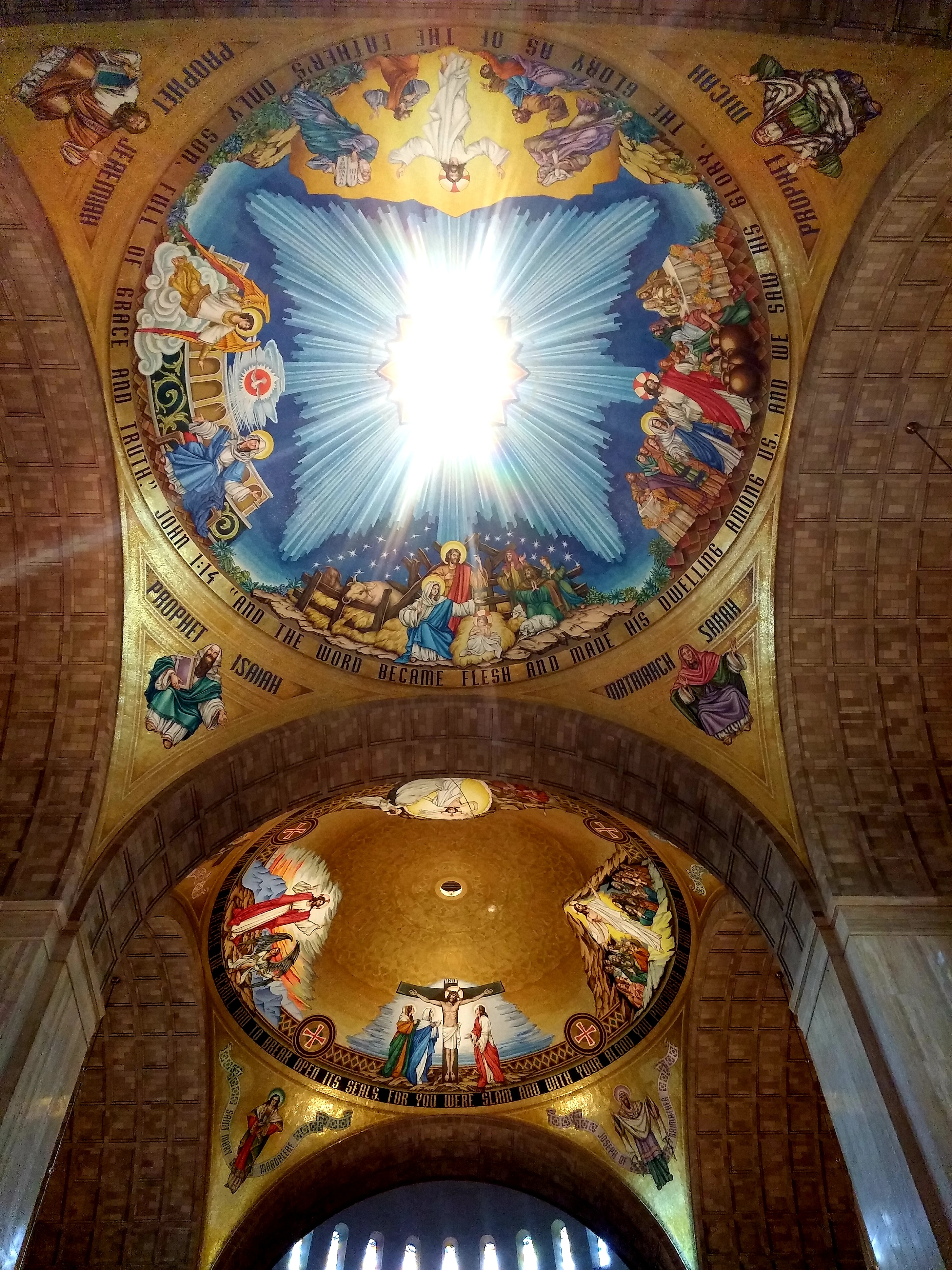 Upon entering the cavernous basilica, any pilgrim’s eye will be drawn upward to a massive mosaic of Jesus that spans from the back wall of the Basilica onto the domed ceiling above the altar. If you look closely, you’ll notice that Jesus’s face is not symmetrical. One side of his gaze seems piercing, while the other is more relaxed.